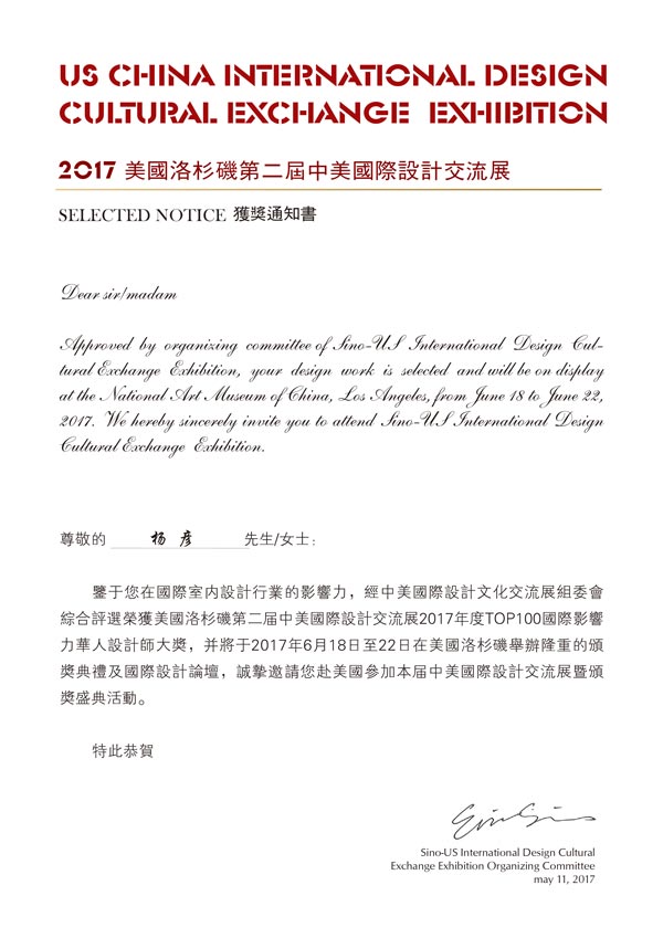 2017年5月11日,中美国际设计文化交流展组委会综合评选结果公布,品彦设计总监杨彦先生荣获第二届中美国际设计交流展2017年度TOP100国际影响力华人设计师大奖,并将出席于2017年6月18日至22日在美国洛杉矶举办颁奖典礼及国际设计论坛。